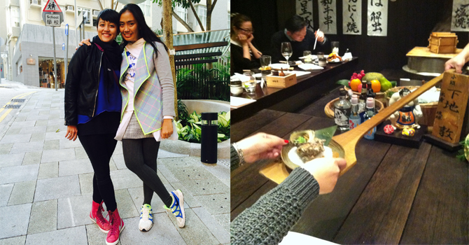 Yang paling berkesan saat kami makan di restoran Sky 100, yang berada di salah satu gedung tertinggi, dan menunya dimasak dengan konsep open kitchen. Setelah itu dihidangkan di piring via sendok kayu panjang, langsung oleh chef di hadapan kita. Kami makan lahap sekali, karena kali ini makan tanpa disela menyusui atau menyuapi anak. Kami juga berburu sneakers di Sneakers Street, mengumpulkan banyak stok foto untuk Instagram dan sempat berkeliling Sun Street –area anak muda Hong Kong, yang isinya deretan toko berisi barang-barang indie karya desainer lokal. Di malam hari, pertama kalinya dalam hidup saya setelah punya dua anak, saya tertidur pulas sepanjang malam dan baru bangun jam 9 pagi! Nikmatnyaaaa... Hahaha...