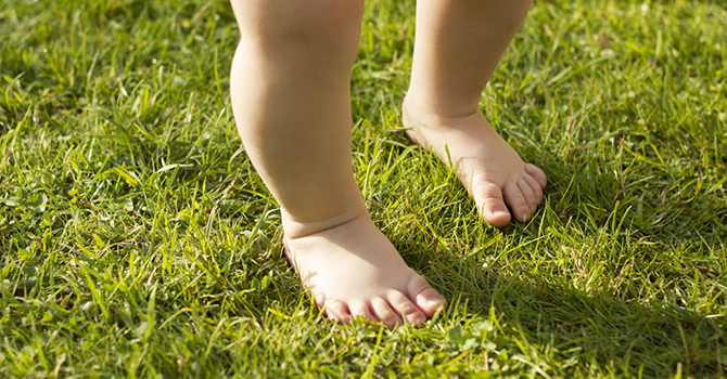 Bunda tak perlu buru-buru beli sepatu buat anak. Balita yang baru bisa berjalan biarkan saja telanjang kaki semaksimal mungkin.