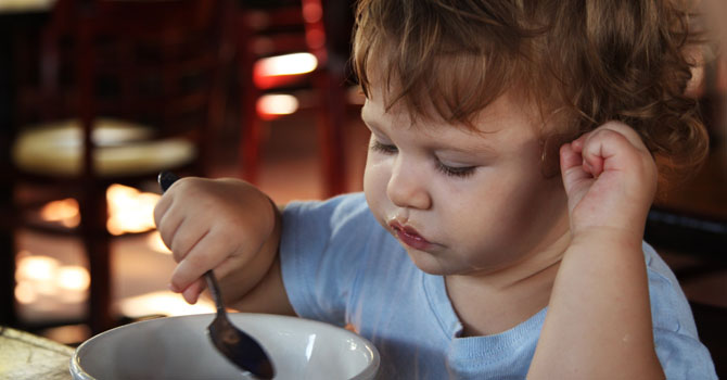 4. Mulai mahir menggunakan sendok, balita sudah bisa makan sendiri. Untuk memudahkan anak makan, berikan ia sendok khusus anak-anak karena sesuai dengan ukuran tangannya.