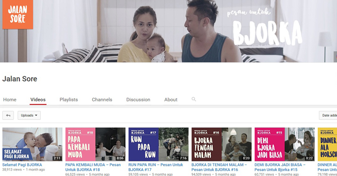 Saking sayang dan bahagianya memiliki buah hati, Bjorka, Ringgo dan Sabai sampai membuat video untuk Bjorka yang diunggah di Youtube Channel Jalan Sore. Channel ini dibuat untuk menyampaikan pesannya ke Bjorka. Agar saat dewasa nanti, Bjorka dapat mengenang kembali masa-masa kecilnya bersama kedua orangtuanya. Hingga artikel ini ditulis, sudah ada 21 vlog yang dibuat Ringgo dan Sabai untuk Bjorka. Ada berbagai macam video, mulai dari Pertama Kali Bjorka Sakit, Tips Memilih Pacar, Bjorka di Tengah Malam. Saksikan ya, bunda! Pasti seru.