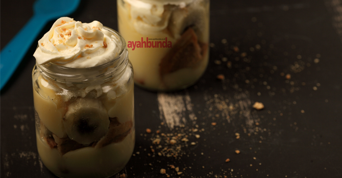2. Siapkan gelas. Masukkan secara bertahap ke dalam gelas: vla, biskuit keping, pisang, dan vla. Ulangi 1 kali lagi, lalu tambahkan whipped cream di atasnya. Sajikan.