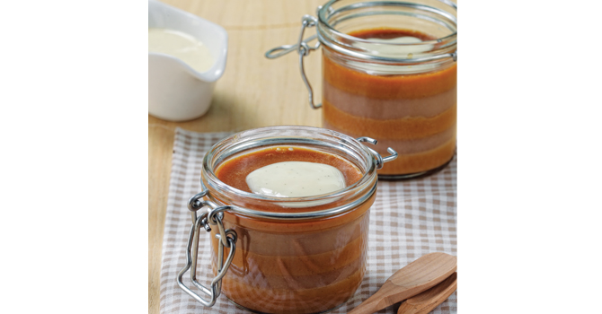 Penyelesaian: Ambil 1 buah gelas saji volume 200 ml, basahi dengan air matang. Sendokkan ± 2 sdm campuran puding karamel, ratakan. Simpan di dalam lemari es hingga setengah memadat (± 15 menit). Keluarkan. Sendokkan ± 2 sdm campuran puding cokelat, ratakan. Simpan di dalam lemari es hingga setengah memadat (± 15 menit). Keluarkan. Ulangi langkah yang sama untuk lapisan berikutnya hingga gelas hampir penuh. Simpan di dalam lemari es hingga memadat (± 1 jam). Keluarkan.