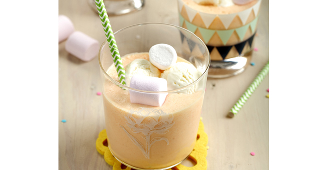 4. Tuang ke dalam gelas saji. Lengkapi dengan 1 scoop es krim vanilla dan taburan marshmallow. Sajikan selagi dingin.